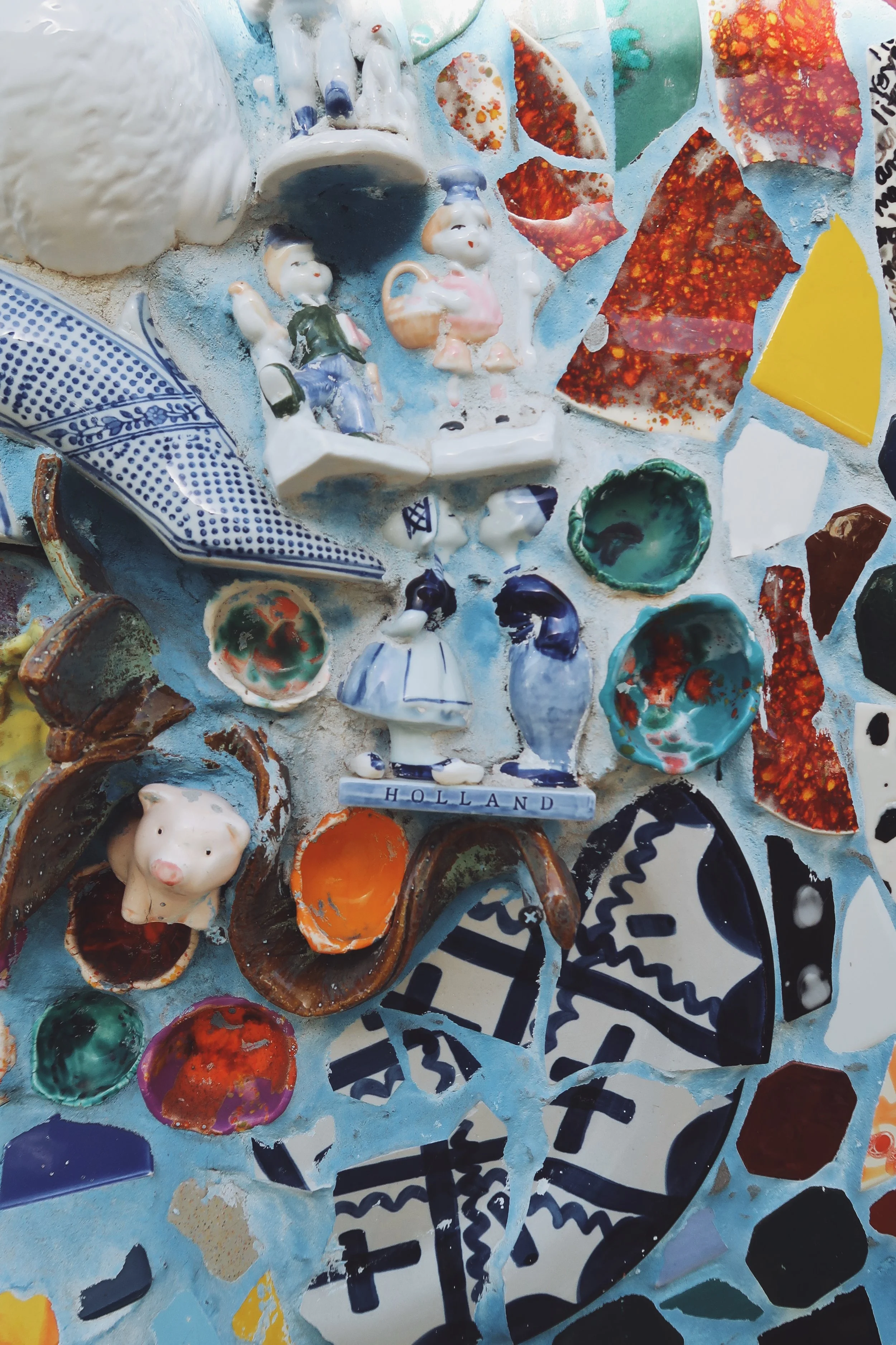 This house belongs to a cute couple, she makes the tiles, he places them all over their property. This endevour started in the bathroom, he found the process to be therapeutic so he moved to other parts of the house, and eventually wound up outside. They are true masters to the craft, from the creation of the tiles, the placement, the themes of different areas...you could spend hours staring at every inch of this house.